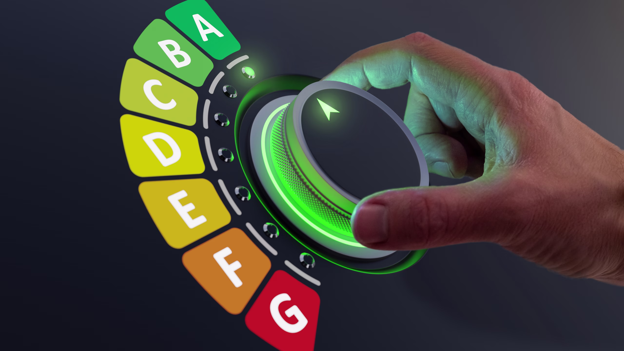 Energy efficiency rating labels promoting low consumption and efficient products to reduce carbon footprint. Lower CO2 emissions with efficient home and appliances. Green eco-friendly business.