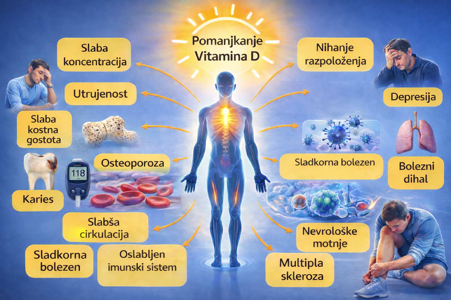 Pomanjkanje vitamina D je povezano s težavami s koncentracijo, nihanjem razpoloženja, utrujenostjo, osteoporozo, kariesom, slabo cirkulacijo, sladkorno boleznijo tipa 1 in 2, imunskimi pomanjkljivostmi, pogostimi okužbami, avtoimunskimi boleznimi, boleznimi dihal, nevrološkimi motnjami, demenco, depresijo, multiplo sklerozo ter bolečinami in mišičnimi krči.