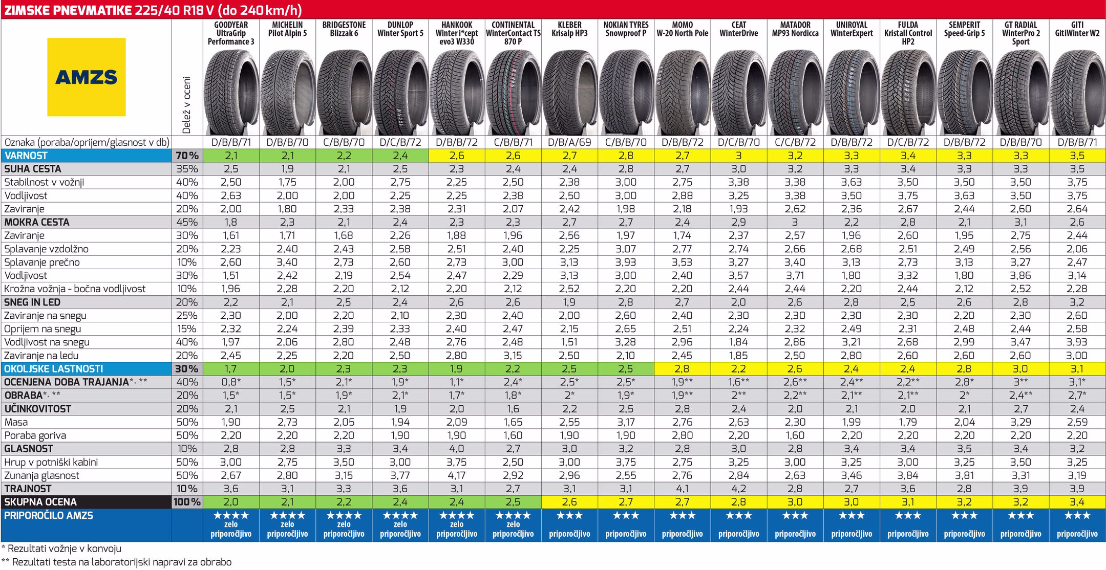 Testirali so zimske pnevmatike dimenzije 225/40 R 18, ki je ena najbolj razširjenih na trgu. Uporabljajo jo družinski avtomobil in cestni terenci, preverjali pa so jo s klasičnim Volkswagnom Golfom.