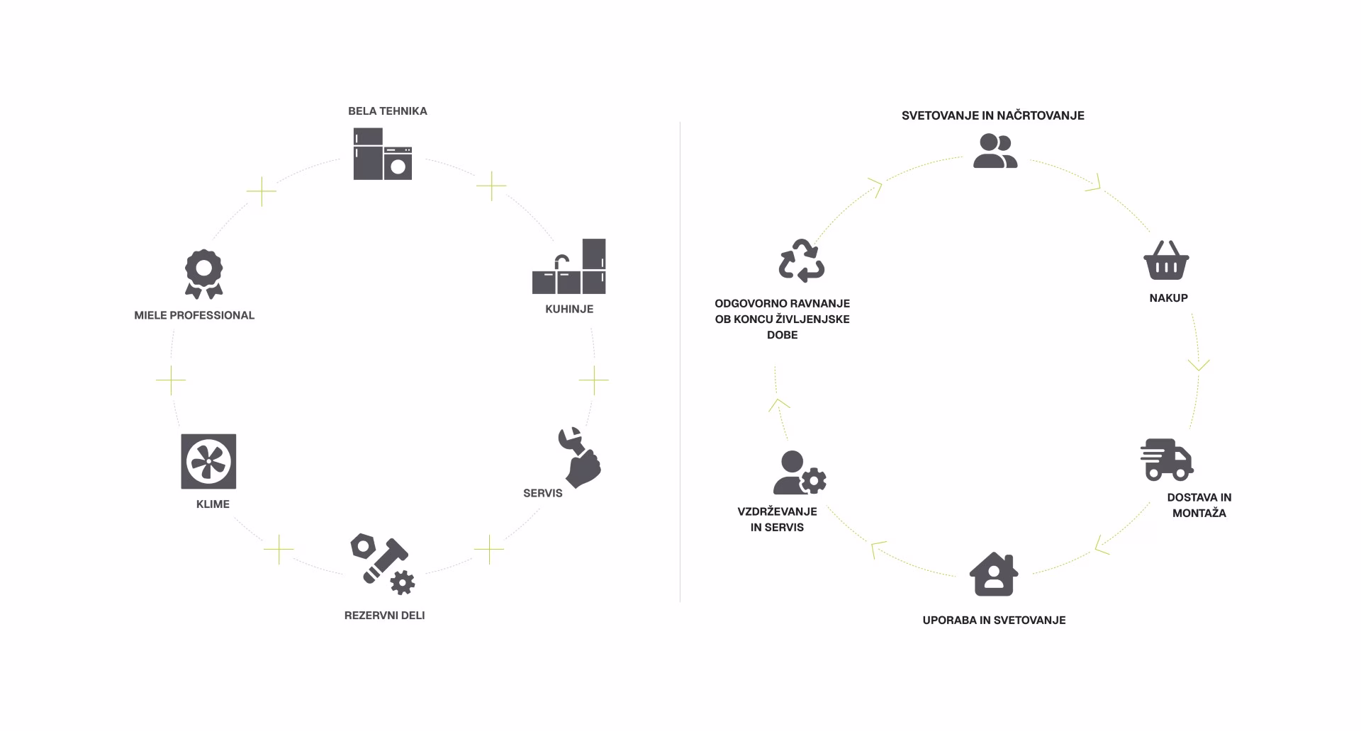 ETIS-ovo poslovanje temelji na šestih stebrih: beli tehniki, kuhinjah, pooblaščenem servisu, rezervnih delih, Miele Professional ter hladilni in klimatski tehniki.